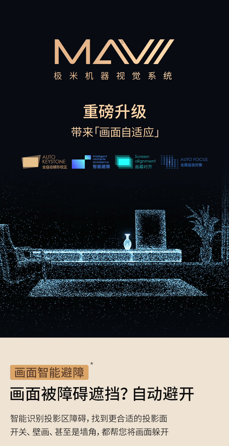 相信很多的投影用户在使用投影时,在投影画面投射的路径中,常常会遇到一些插座、装饰摆件等障碍物,投影画面则会被这些障碍物遮挡影响观看体验。此次极米更新的MAVII视觉系统就能够很好的帮助用户解决这个问题,通过感应模组和全新的算法,在梯形校正的过程中能够自动识别障碍物,找到最适合的投影面,省去了自动梯形校正后还须手动调节避开障碍物的繁琐过程。