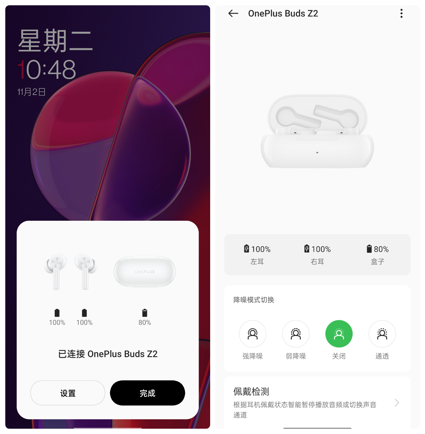 因为这款耳机是与一加9RT一同发布,因此在体验时我也专门连接一加9RT进行试听,没想到这个价位,一加也给出了弹窗动画:只需要打开耳机盒盖靠近手机,即可自动弹出连接窗口,初次连接完成后,每次开盖还将显示充电仓、耳机的电量。这个设置对于经常忘记给耳机充电的同学们来说,可以说是相当贴心了。