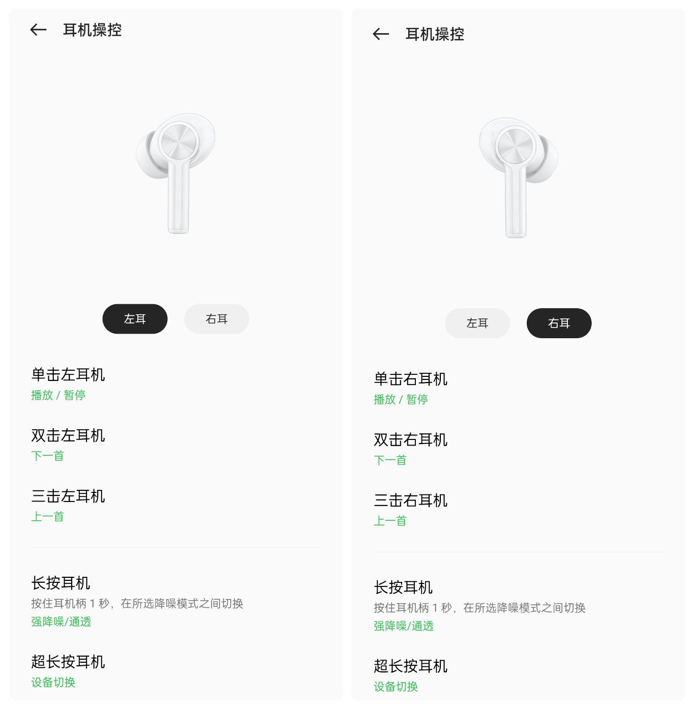 这还没完,为了更好的操控耳机,一加还推出了非常丰富的耳机设置界面,无需下载软件即可进入。在这里,你不仅可以更改Z2的降噪模式,还可以自定义两支耳机的触控操作。