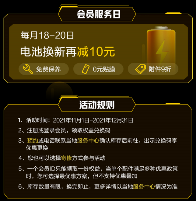 本次活动的参与方式十分简单,在“vivo官网APP”注册或者登录会员后,依次找到我的--售后服务--全部服务--下滑【特色服务】下方的活动推荐区,左右滑动即可查看到该活动页面,便可以领取权益兑换码。而用户在预约或者电话联系当地服务中心确认库存后,前往服务中心、并且出示兑换码后即可享受服务。对于不便前往门店的用户,还可以选择寄修的方式。值得一提的是,在每月的18~20号会员服务日期间,可享电池换新价格减10的优惠,并提供了免费保养、0元贴膜、附件9折等优惠,大家也可以关注一下这些售后权益。