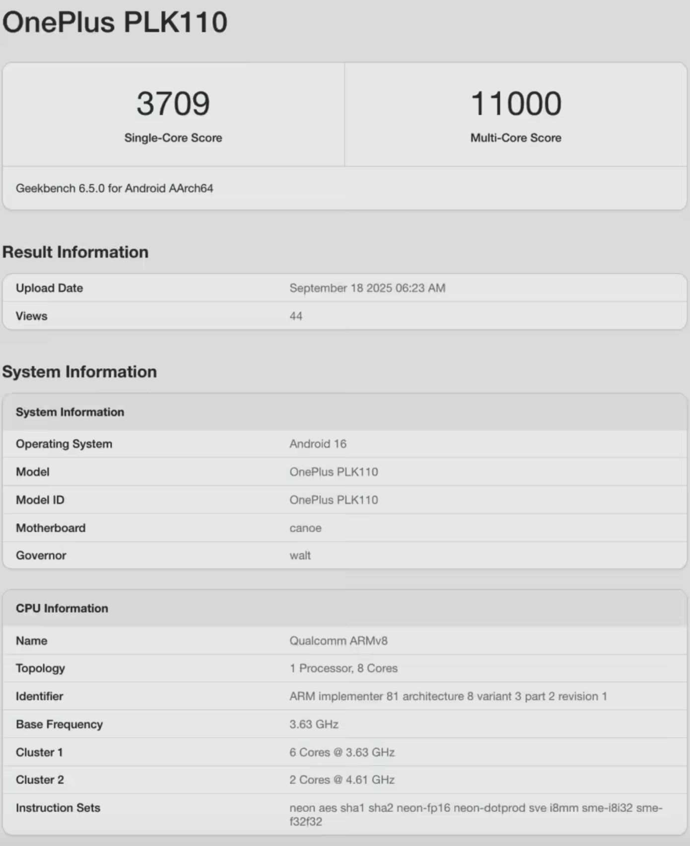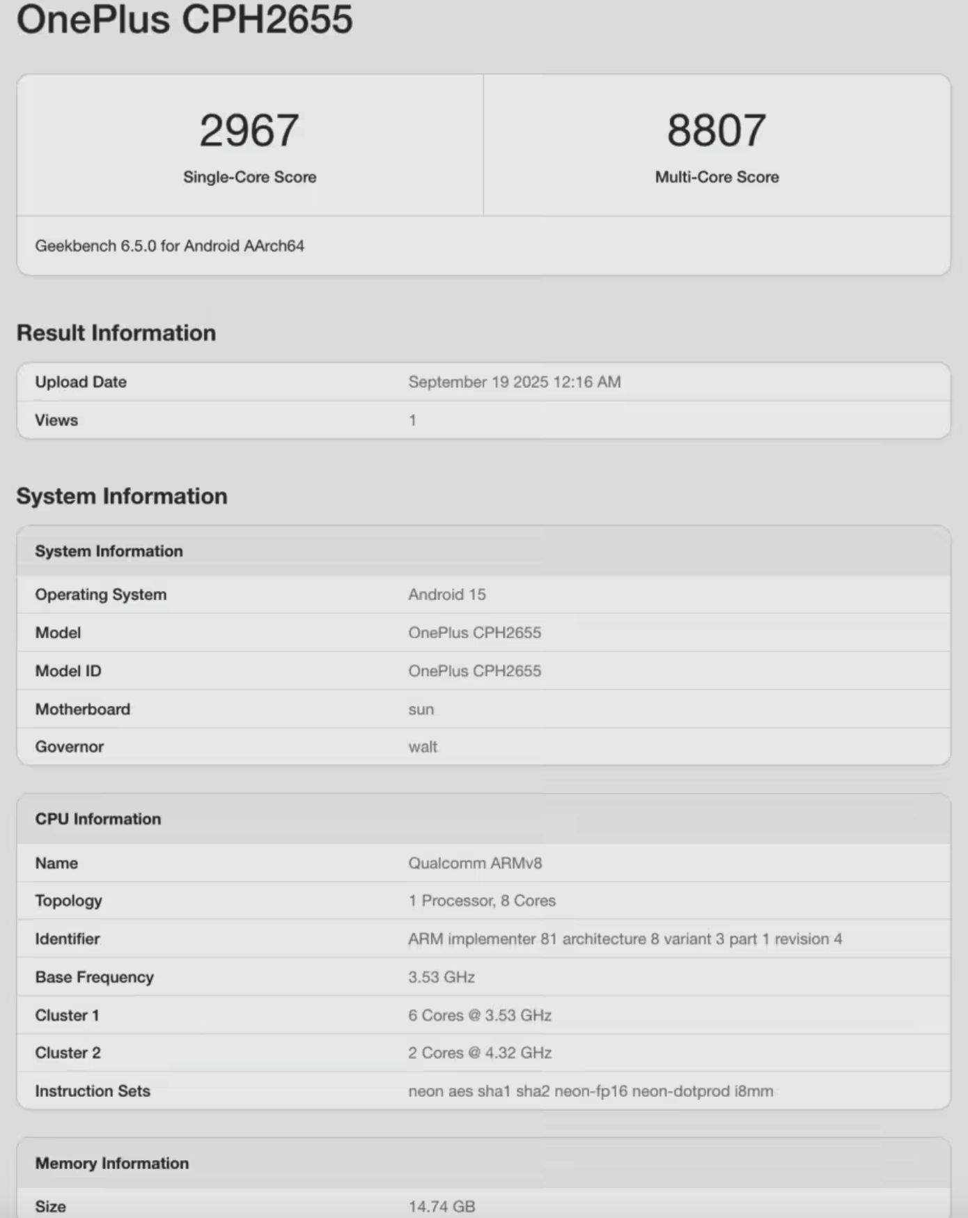 9月19日,科技媒体Notebook Check最新数据显示,一加15工程机在Geekbench 6测试中单核得分3709分,多核得分11000分,相比前代一加13(单核2967分/多核8807分)性能提升约25%。该机搭载的高通骁龙8 Elite Gen5芯片成为核心亮点,预计将于2025年10月底至11月初在中国市场发布,成为安卓阵营首批搭载该旗舰处理器的机型之一。