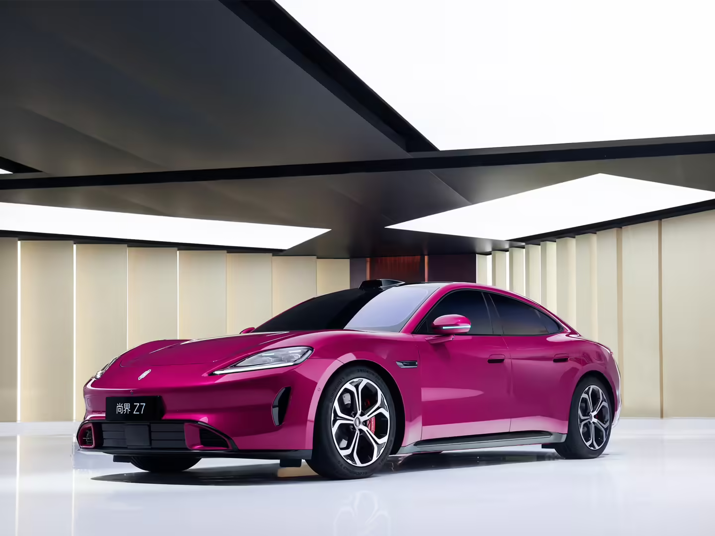 尚界Z7采用经典轿跑低趴姿态,车身尺寸为5035mm*1999mm*1465mm,轴距长达3000mm,既保证动感造型,又兼顾后排驾乘空间。外观主打流体力学溜背造型,搭配贯穿式星环尾灯、主动式进气格栅、低风阻运动轮毂,整车风阻系数低至0.21Cd,兼顾颜值与能耗表现;提供电光紫粉、极夜黑、星河银三款专属车漆,其中电光紫粉采用纳米渐变工艺,辨识度拉满。车身用料堪称同级天花板,高强钢与铝合金占比高达91%,乘员舱核心骨架采用2000兆帕潜艇级热成型钢,搭配7×24小时云端电池看护系统,全方位保障驾乘安全。