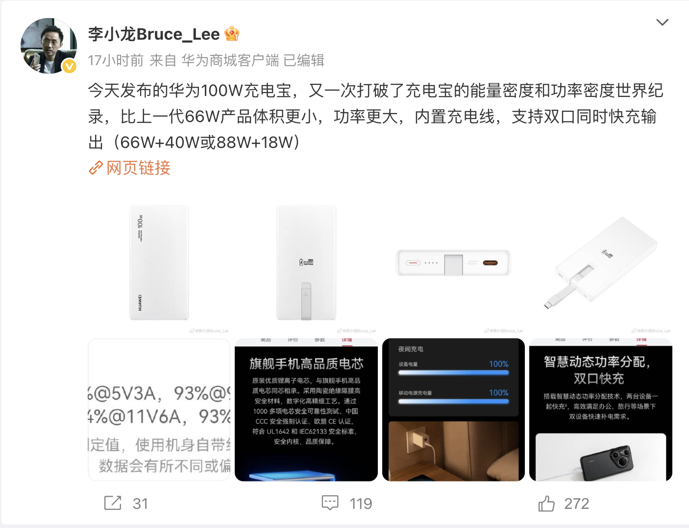 在9月4日的华为MateXTs非凡大师及全场景新品发布会上,华为推出了全新充电宝——华为自带线全能充电移动电源100W12000mAh。华为终端BGCTO李小龙介绍,该产品打破了充电宝的能量密度和功率密度世界纪录。