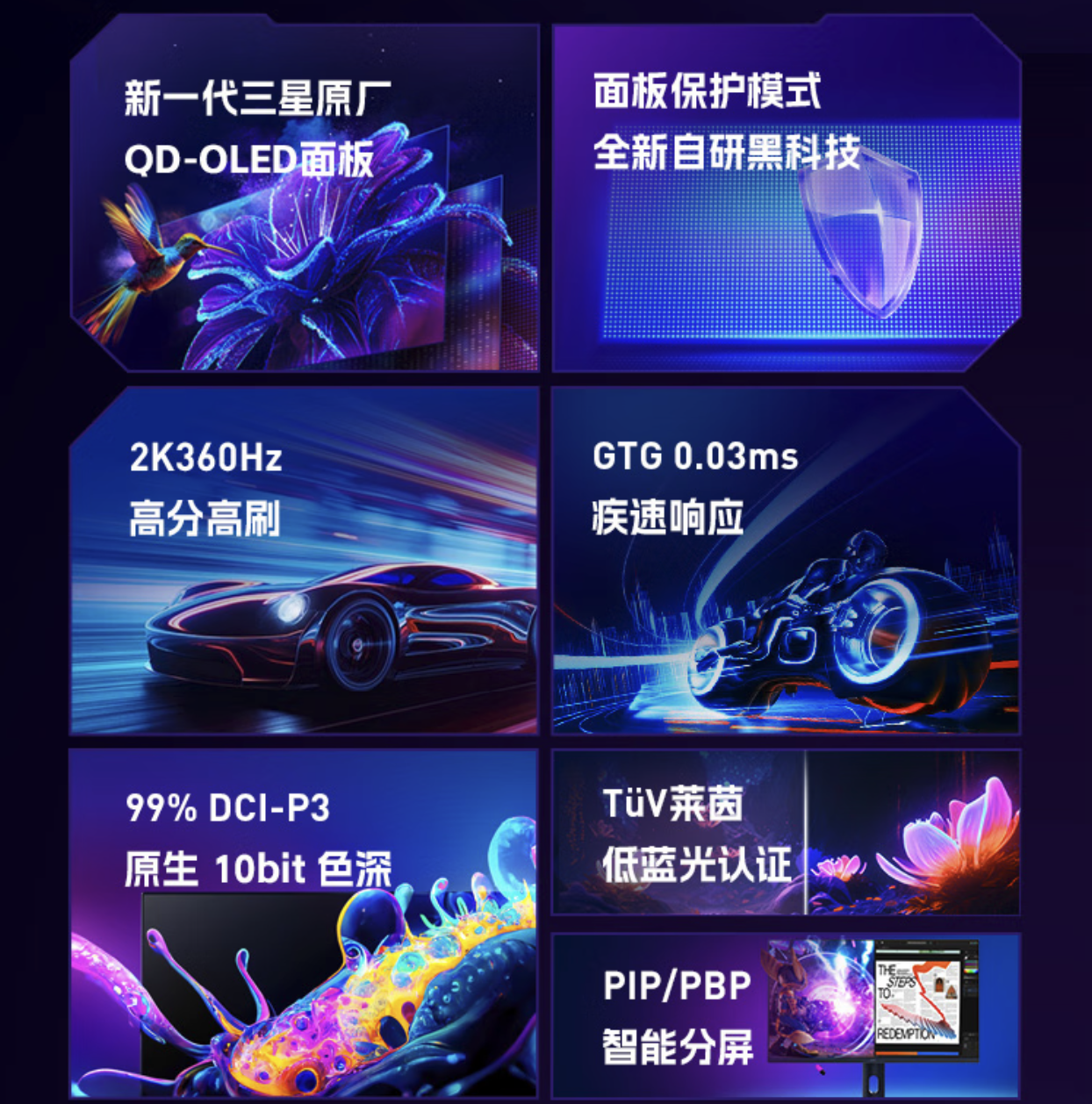 360Hz刷新率配合1ms灰阶响应(GTG),大幅减少高速运动画面的拖影与模糊,适配《CS2》《永劫无间》等电竞游戏,支持AMD FreeSync与NVIDIA G-Sync技术,消除画面撕裂。