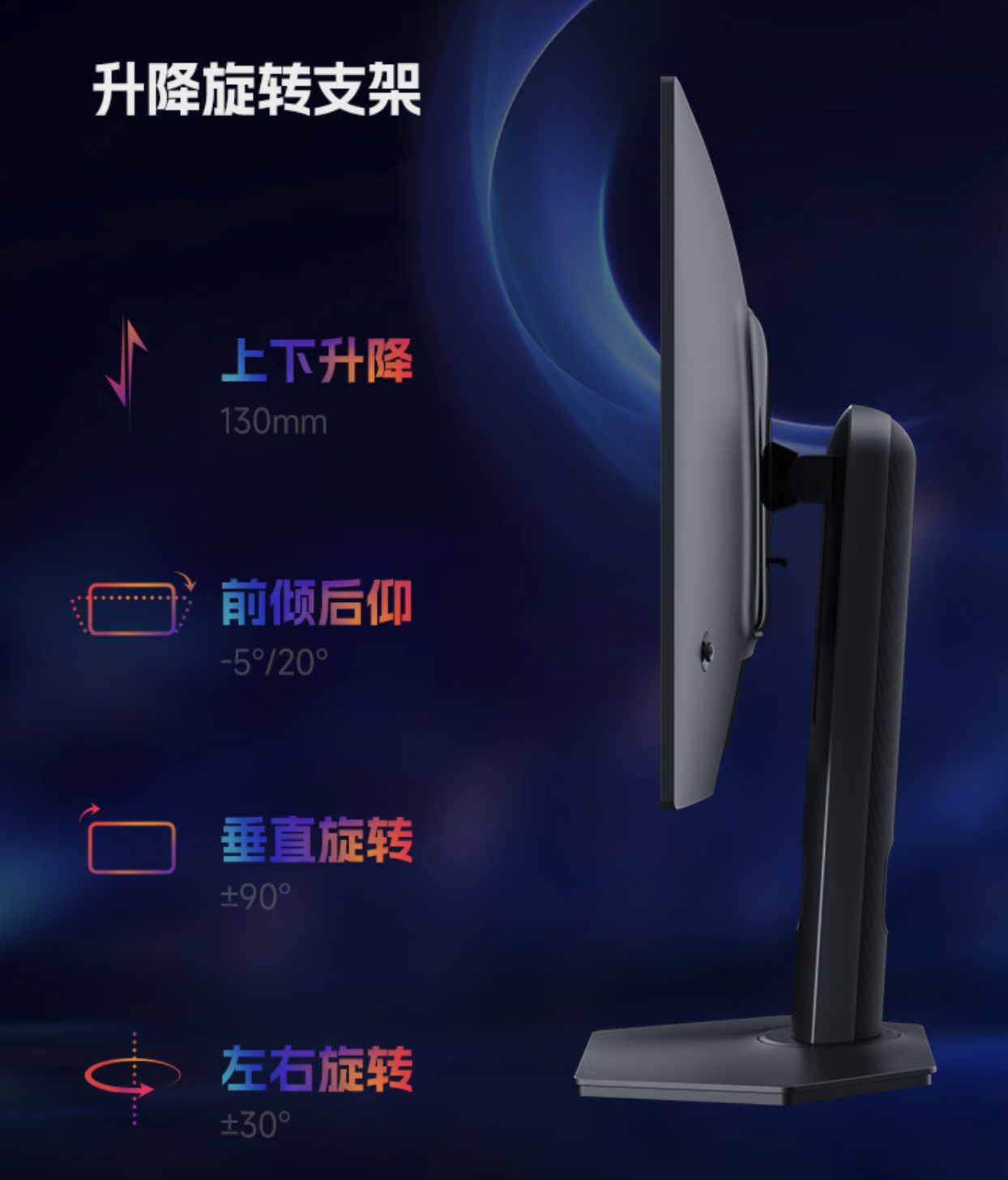 采用窄边框设计,厚度控制在8mm以内,重量约1.8kg,搭配可升降(±50mm)、倾斜(-5°至20°)、旋转(±45°)的金属支架,适配不同桌面布局与坐姿需求。内置环境光线传感器,自动调节屏幕亮度至舒适区间;支持低蓝光模式与无闪烁技术,降低长时间使用的视觉疲劳。