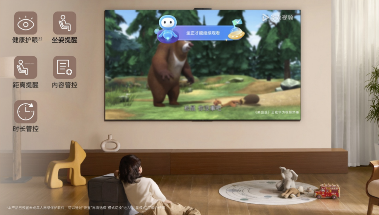 华为Vision智慧屏 5 Pro的关怀贯穿于家庭生活的每个细节。产品通过了莱茵低蓝光和无频闪双认证,能有效过滤有害蓝光,即使长时间观看,双眼也不易感到酸涩。此外,还贴心设置了儿童模式,配合AI摄像头可以智能识别孩子的观看距离和坐姿。一旦发现坐姿歪斜或距离过近,视频将自动暂停并发出提醒,以科技之力守护孩子的用眼健康。