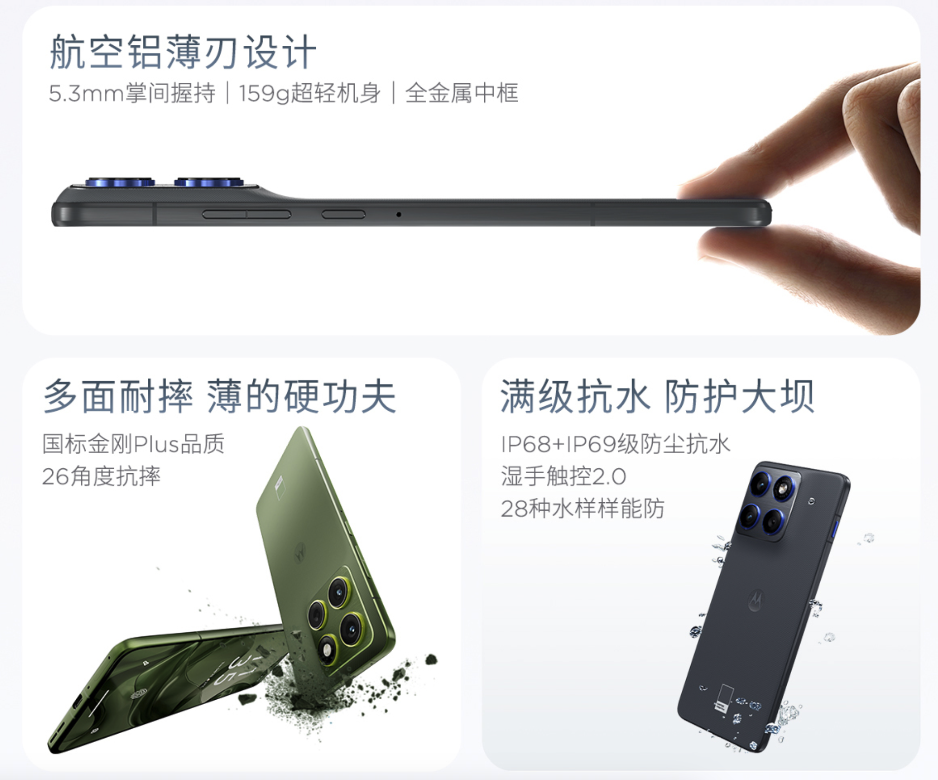 moto X70 Air的最大标签是“超轻薄”——5.3mm的机身厚度(含中框)与159g的重量,较同期旗舰机型(如iPhone 15 Pro Max的8.3mm/221g、三星Galaxy S25 Ultra的8.4mm/229g)大幅领先。