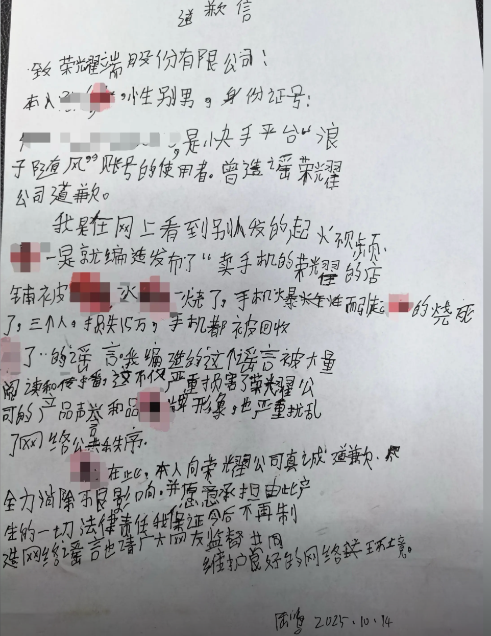 在道歉信中,陆某明确表示,其同时为快手平台 “浪子随风” 账号使用者,此前在网上看到无关起火视频后,便随意编造荣耀门店起火的谣言并发布。他承认该谣言 “严重损害荣耀公司产品声誉与品牌形象,严重扰乱网络公共秩序”,并承诺将 “全力消除谣言造成的影响,自愿承担由此产生的一切法律责任”,同时保证 “今后不再制作、传播网络谣言,接受广大网友监督,共同维护良好网络环境”。