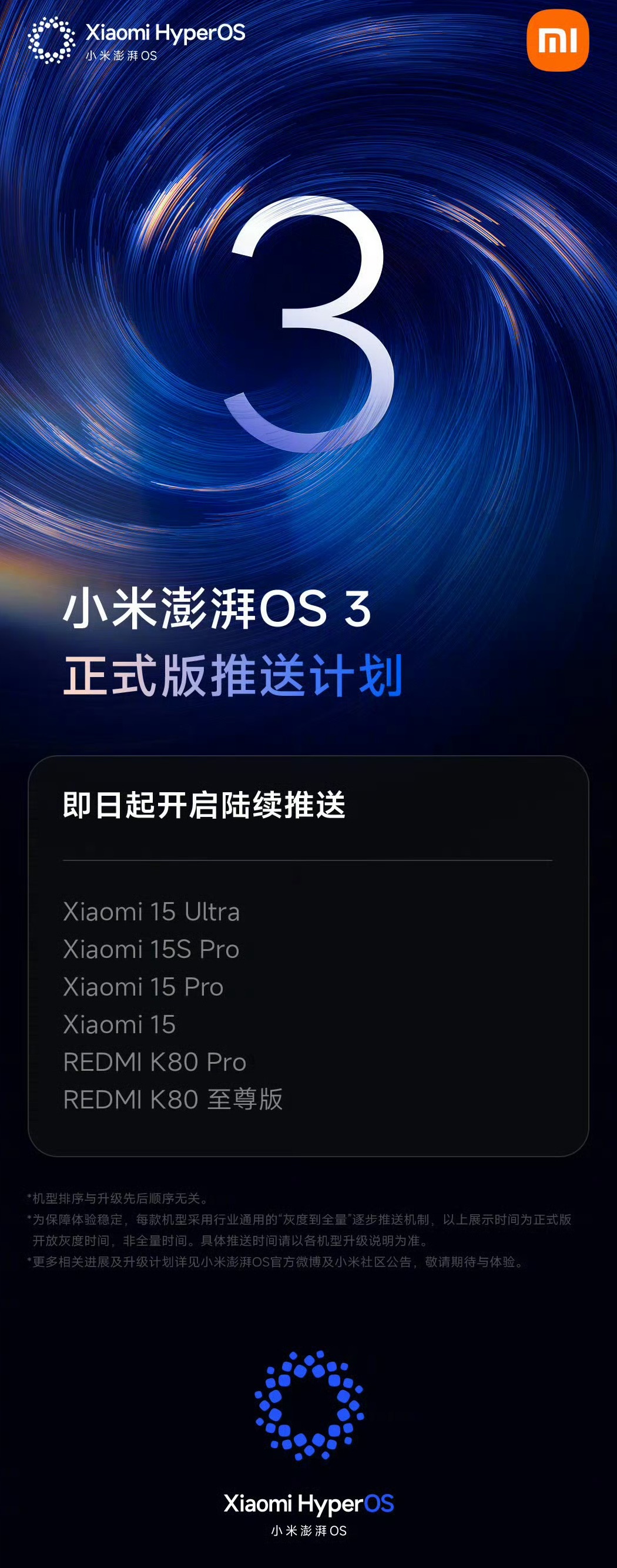 10月15日消息。昨日,小米正式宣布澎湃OS 3操作系统开启首批存量机型推送,覆盖Xiaomi 15系列、REDMI K80 Pro等多款热门机型。此次推送标志着澎湃OS 3从新机首发阶段迈入存量用户覆盖期,用户可通过“设置-我的设备-系统更新”检查并升级至最新版本。