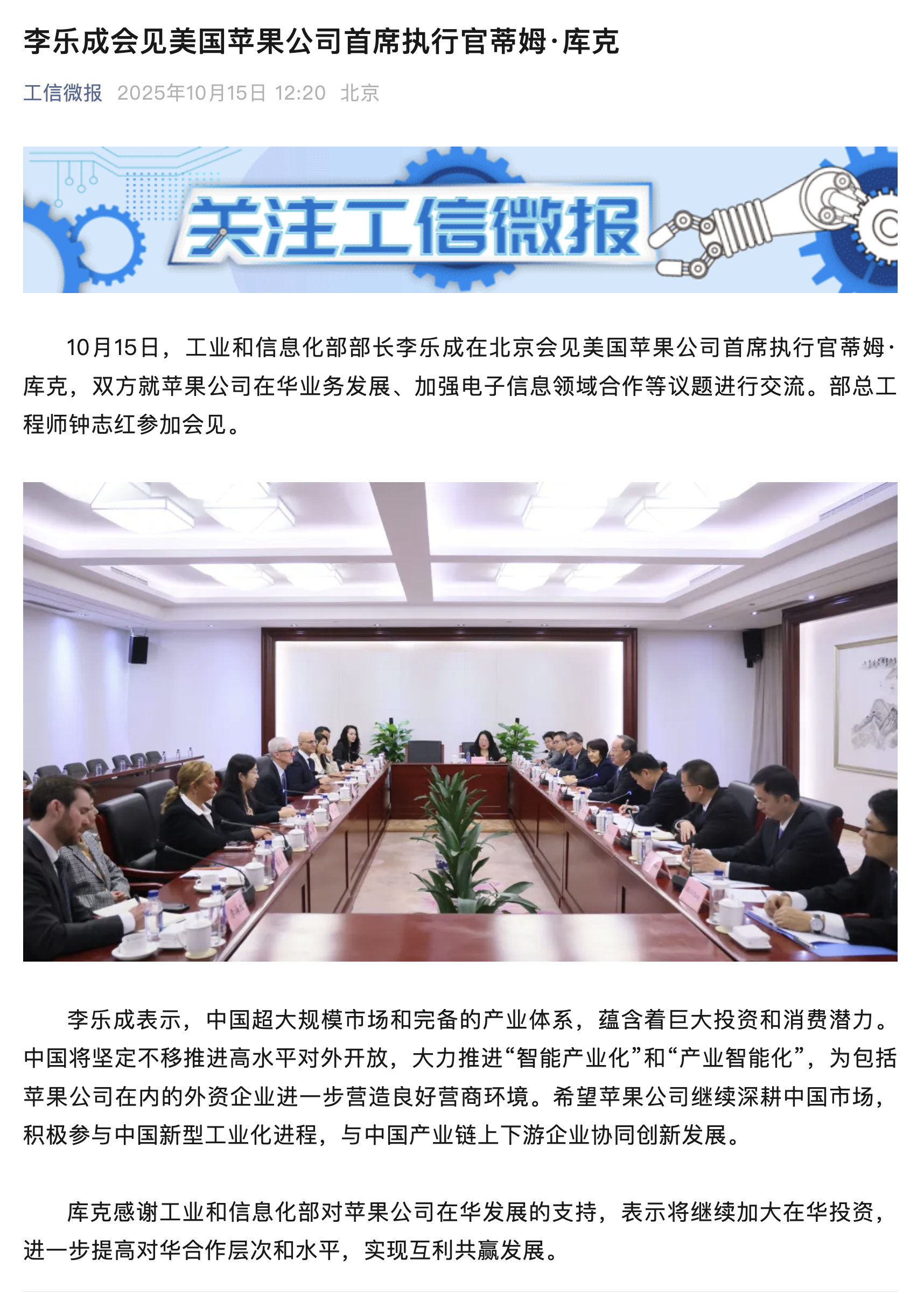据“工信微报”消息,2025年10月15日,工业和信息化部部长李乐成在北京会见美国苹果公司首席执行官蒂姆·库克,部总工程师钟志红参加会见。